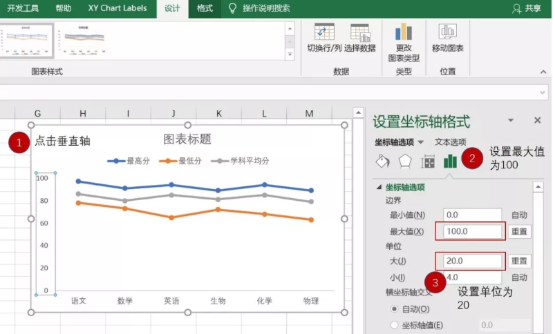 ②点一下竖直纵坐标,设定竖直纵坐标的最高值为100,企业尺寸为20。点一下水准纵坐标,将线框设定为灰黑色,实线,并将字体设置为微软雅黑,色调为灰黑色,实际操作如下图图示。
