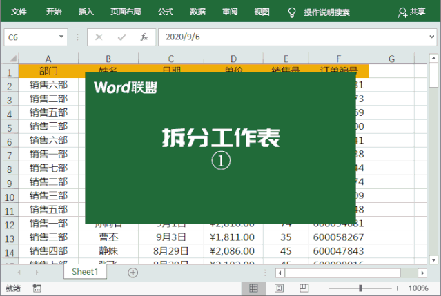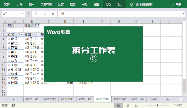 如下图所显示,从市场销售一部到市场销售七部的全部销售业绩,所有都会一个表里边,如今大家将报表中数据分拆到七个工作簿中,并全自动取名。