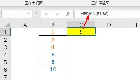 【例】:下面的图中国共产党6个数,数字5比前3个数据大,比后期3个数据小,它便是这6个数的中值。