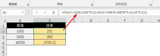 比如A数值30876,或是超过30876,则标值为30876*0.12;假如A数值30876-2100中间,则A数值*0.12,假如低于2100,则A为2100,立即乘于0.12