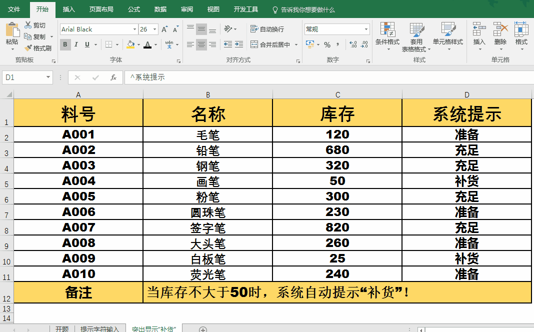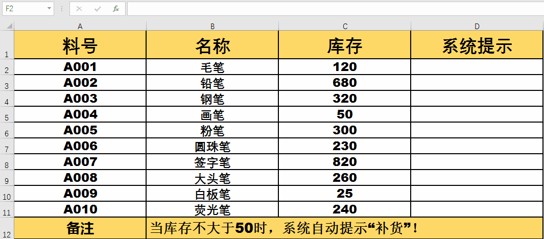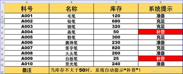 在上表中,根据商品库存,系统会自动提示是否“补货”并突出显示其状态。