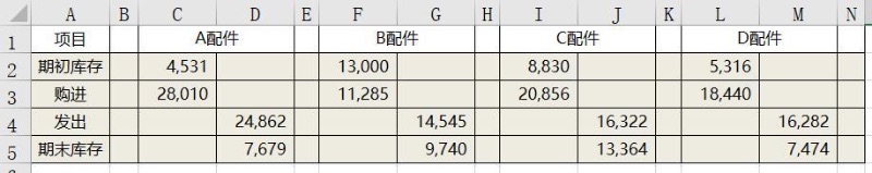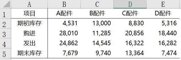 表格结构转换的目的是使用堆叠柱形图。每个附件有三栏:期初购买库存、期末发行库存和空白栏。空白单元格没有数据,绘制图形时也不会有柱形图。使用此功能制作购买、销售和存款的对比分析图表。期初购买库存等于期末发放库存。这两列的长度相等。在期初和期末库存,采购和发料被精确地比较。
