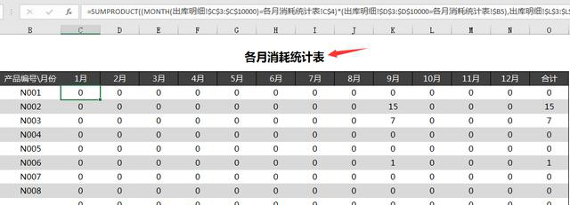 部门消耗统计,该表只需首次使用前录入产品编号及部门,即可统计各部门各种物料的详细消耗情况。