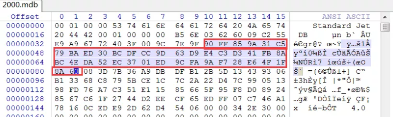 存储在数据文件中的二进制0x42的最后40个字节是数据库查询的登录密码位。每个两个字节存储一个登录密码位。编码方法是unicode。加密文件中的数据加密字节号从未加密文件的相对字节号(无数据加密的访问文档)更改。(下图红色框中数据库查询的数据加密位)