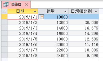 日增长幅度占比:([销售量]-DLookUp("[销售量]","[data]","[时间]=#"&[时间]-1&"#"))/DLookUp("[销售量]","[data]","[时间]=#"&[时间]-1&"#")