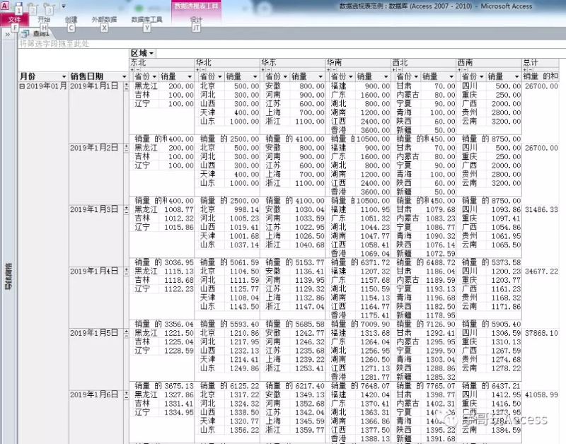 它是Access做的数据透视表,跟Excel有一些不一样,精确的说,作用更强。Excel的数据透视表无法开展二次嵌套循环(我创造发明的词),可是Access就可以开展。例如图中中的地区和省区便是开展了二次嵌套循环,看见更为显眼和形象化。