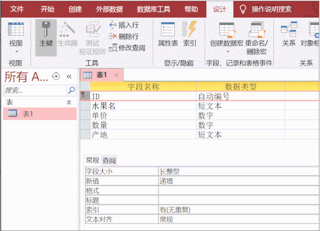 假如必须挑选新鲜水果名叫主键,点一下水果名的字段,随后点击设计菜单栏,最左边的专用工具中的“主键”按键。就可以设定。