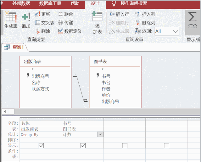 建立查询设计方案,双击鼠标publisher表的name字段名书表的书籍序号字段名。点击右上方的引言,将总列加上到底端,在name字段名下挑选groupby,并在booknumber字段名下挑选count。
