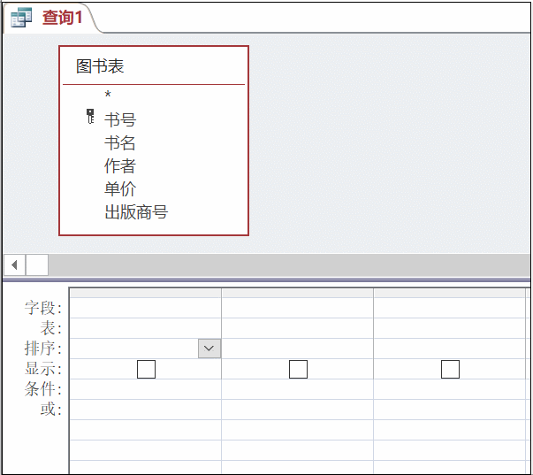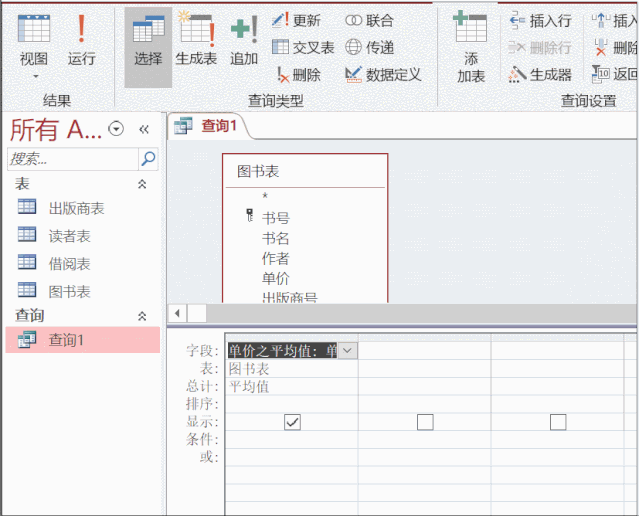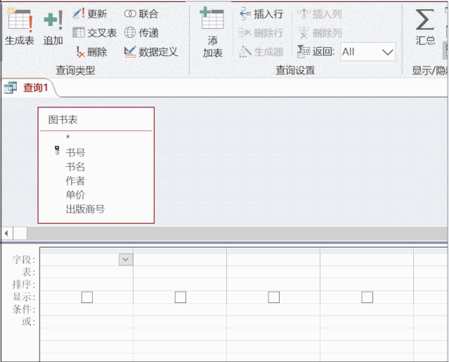 如上所述,采用下列流程明确数据库为"书表"。建立查询设计方案并加上表簿表。