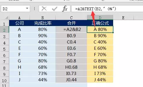 二般状况下,再联接就不行,例如C列联接后百分数变成了小数。这时候就必须应用text涵数固定不动文件格式。