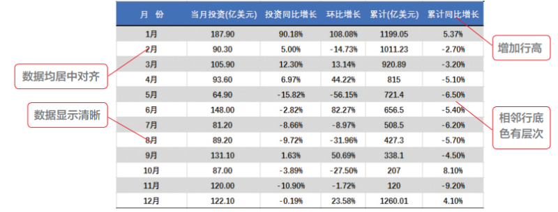 ②易阅读文章:让表格更个性化、更非常容易阅读文章有4个关键点。第一,要这样能保证数据显示信息清楚,即数据信息的字体样式不可以很小不方便分辨,也不可以很大看起来粗狂。字体样式要与背景色产生比照,如黑底白字、白底黑字;第二,单元格中的数据信息要两端对齐显示信息,不可以同一列单元格中,有的单元格数据信息是左两端对齐,有的单元格数据信息是右两端对齐;第三,以便差别行与行中间的数据信息,能够 为邻近二行的单元格设定浓淡不一的背景色添充,以提升质感,便捷阅读文章;第四,数据信息不可以挤在一起,因而必须有间隔,即扩大单元格的行高和列宽,如下图所显示。