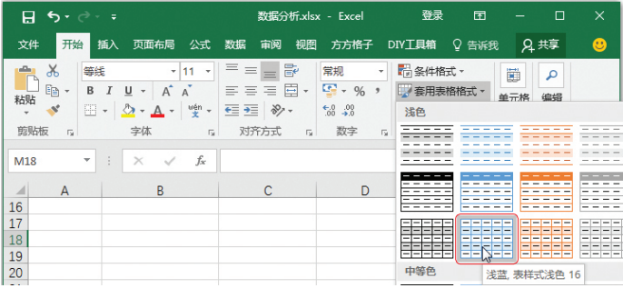 流程01挑选款式。点击【刚开始】菜单栏下【套入表格文件格式】按键,从下拉框中挑选一种表格款式,如下图所显示。